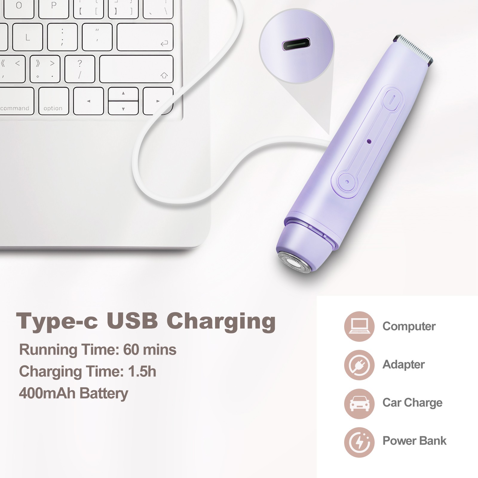 Equipped with Type-C smart charging (red light when charging, green when full) plus overcharge/discharge protection, it has independently controlled dual heads for face (lips/chin), underarms, limbs, etc. The gradient-color, portable design also makes it perfect for travel.