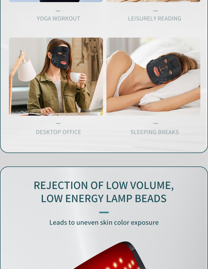 Full-face even coverage: Densely arranged light beads + mask-fitting design ensure no dead spots (forehead, cheeks, jawline, etc.) during light therapy.