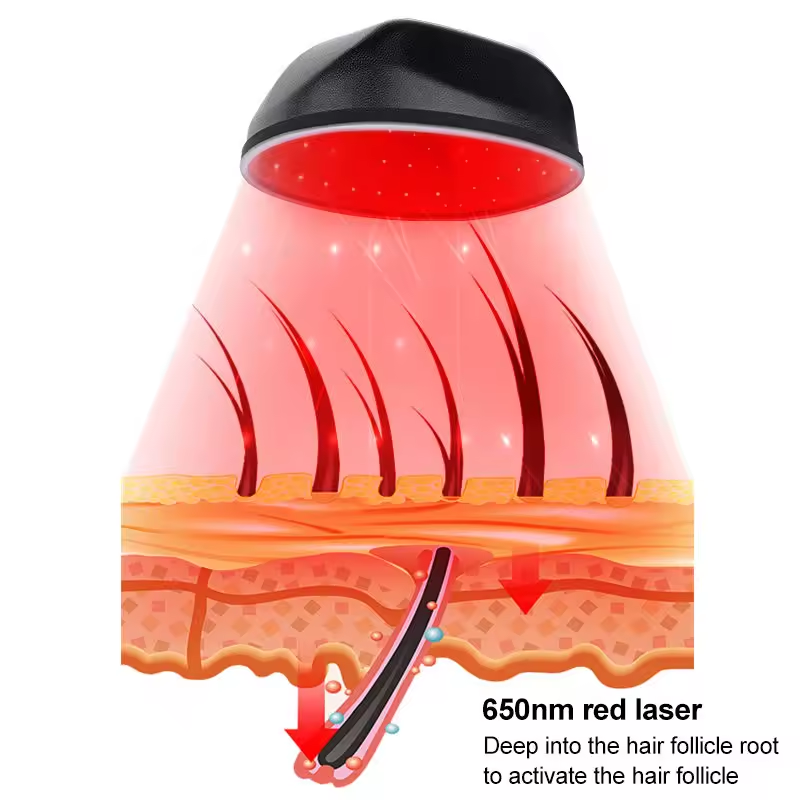 The Laser Hair Regrowth Cap uses 650nm red light technology with 22 lasers and 100pcs LED lamps that target hair follicles precisely. It boosts cellular respiration, activates dormant follicles, and addresses 90% of hair concerns like hair loss and receding hairlines, promoting the growth of healthy strands.